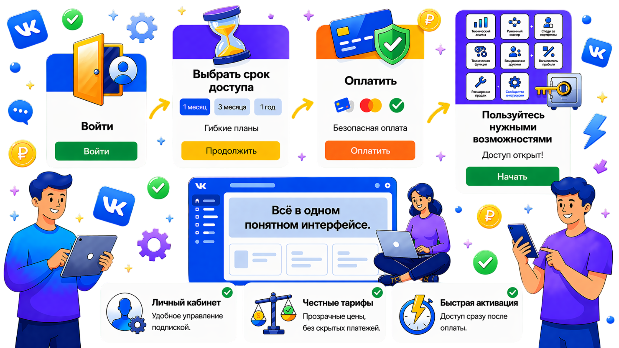Быстрый вход в кабинет, удобный выбор срока доступа и простое управление подпиской — всё в одном месте и без лишней сложности.